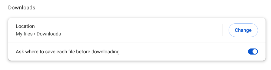 By default, any downloads are automatically saved to the Downloads directory. To change this behavior I click on the three vertical dots, then select Settings and on the left menu select Downloads. From here I can change the downloads directory and set Chrome to ask where to save the files I download.