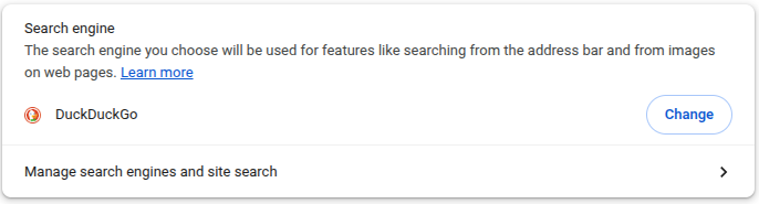 And while in Settings I can also change the search engine. Of course, Google is the default search engine for Chrome, but I think that DuckDuckGo is the better choice. Google tracks your browsing activity and will send advertisements to you based on your searches. DuckDuckGo’s motto is: “It’s fast, private, and free!” And I believe them. I have yet to receive an ad based on searches with DuckDuckGo.