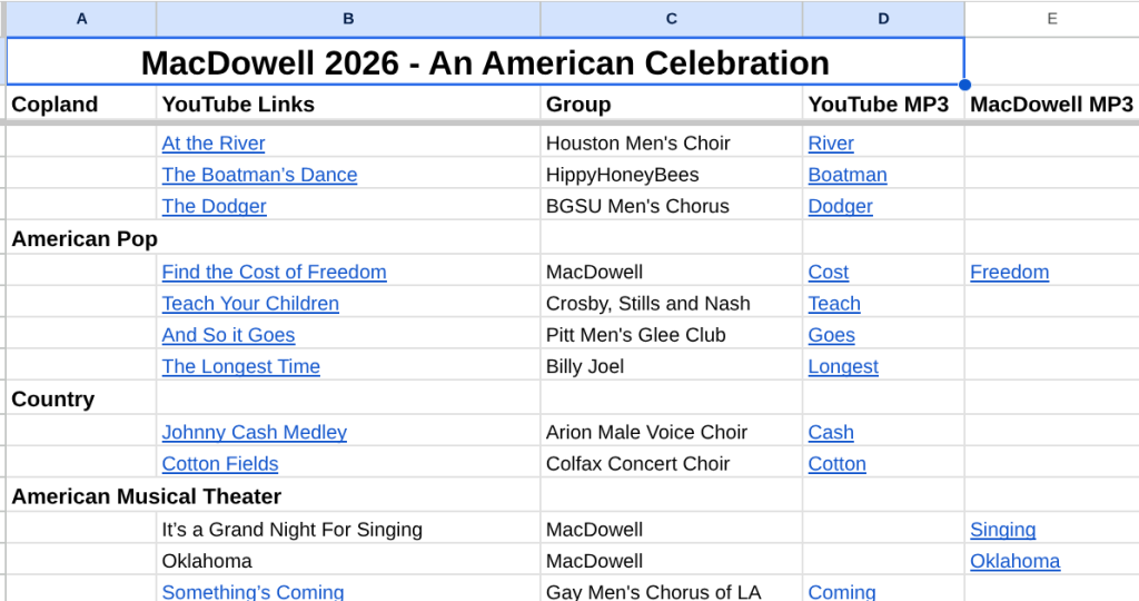 That is my cue to start looking for practice MP3s and videos (primarily on YouTube) to compile and place into Google Sheets for the members. I am an unofficial “electronic music acquisition specialist” for the Chorus. Fortunately MacDowell has a long history of past performances that have been recorded over time from which to choose.